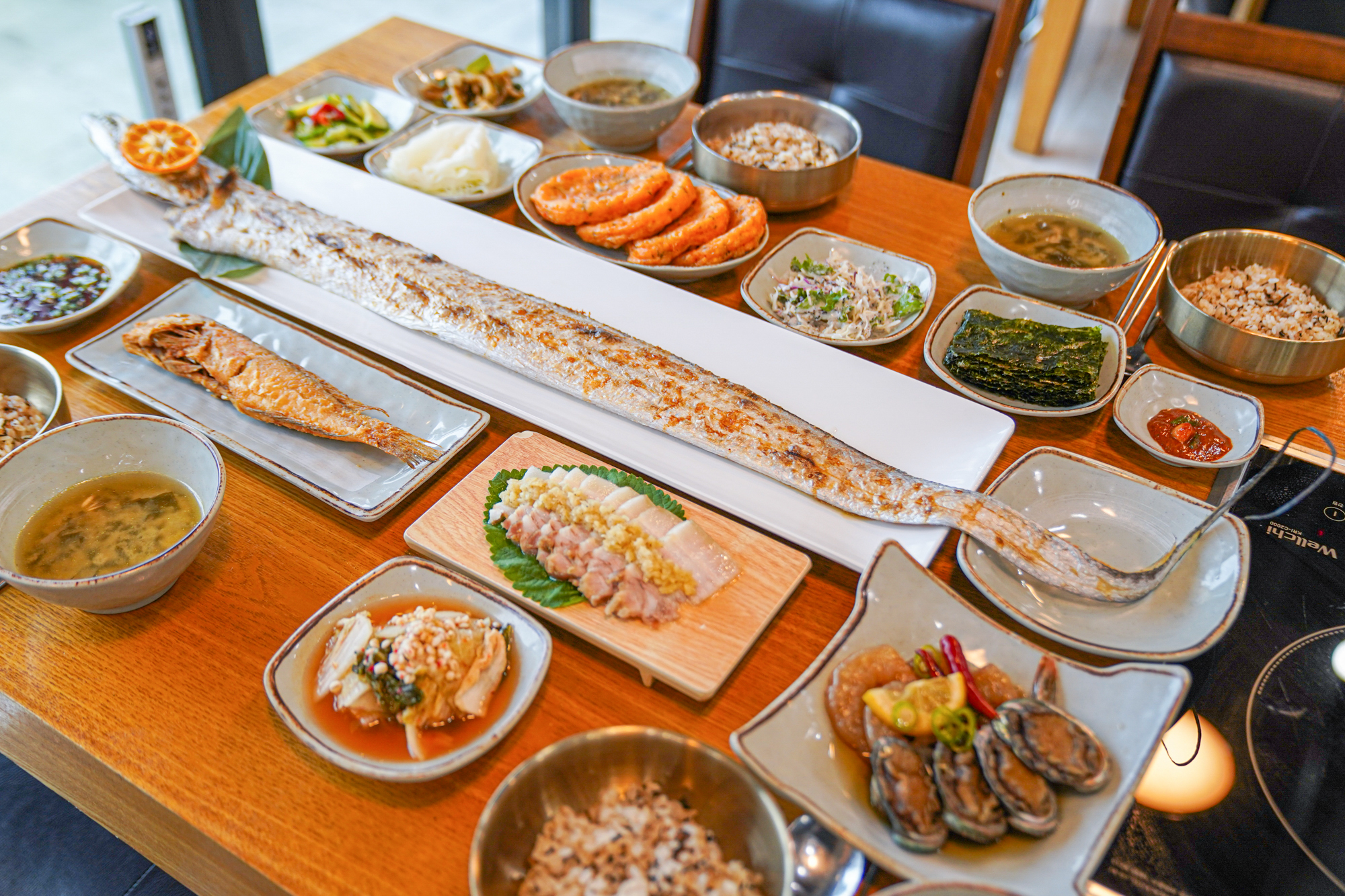 Now, let's talk about the generous Korean table setting. It's a feast for the senses! On a single plate, you'll find grilled giant cutlassfish, braised cutlassfish, sea bream, grilled tilefish, abalone paste, shrimp paste, and mouthwatering kimchi pancakes.