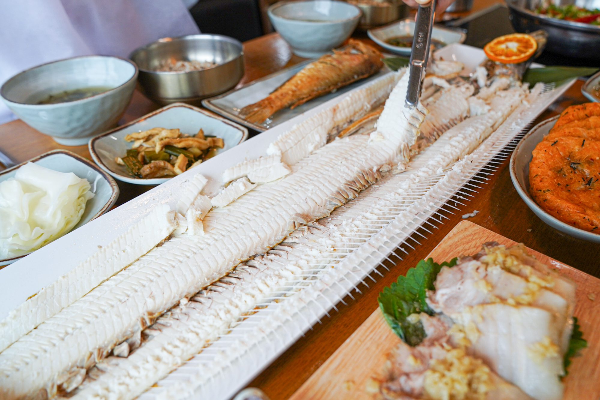 Notice how plump and tender the cutlassfish meat is? It's a delicacy unique to Jeju Island, and it measures over 50cm in length.
